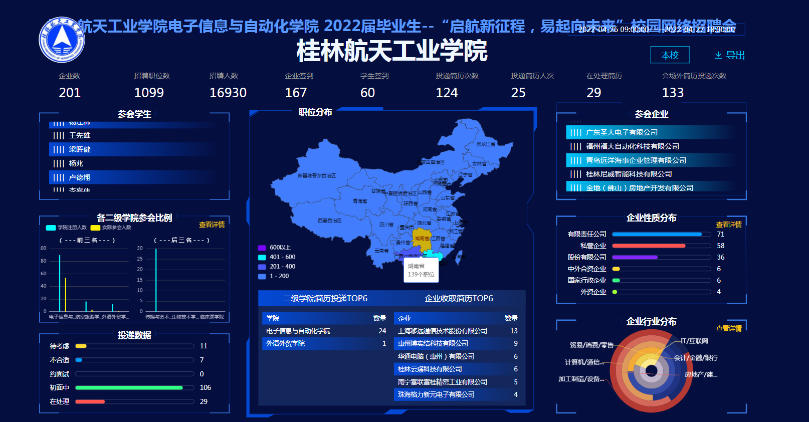本次网络双选会共有201家企业单位参会,涉及IT互联网、加工制造、计算机、通信和贸易等众多行业。上海移远通信技术股份有限公司、深圳思榕科技有限公司、云南白药集团健康产品有限公司等多个省市地区的优质企业,为毕业生提供1099个岗位,招聘人数16930人,为毕业生搭建了高品质的岗位双选平台。