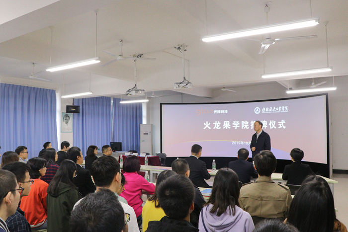 桂林光隆科技集团股份有限公司董事长彭晖首先表达了对母校的感谢和支持。他表示,在光电信息产业发展的最好时期,与母校合作成立“火龙果”公司,通过校企深度合作,促进资源优势互补,能使员工的实践能力及技术水平方面实现本质突破,培养更具市场竞争力的人才,实现员工、公司、企业和社会多方共赢。