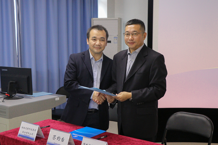在大家的热烈掌声中,李幼平和彭晖为“火龙果公司”揭牌,杨杰副董事长与桂林光隆科技集团股份有限公司总经理陈春明共同签署了协议,这也是公司校企合作发展上的又一次有力践行。