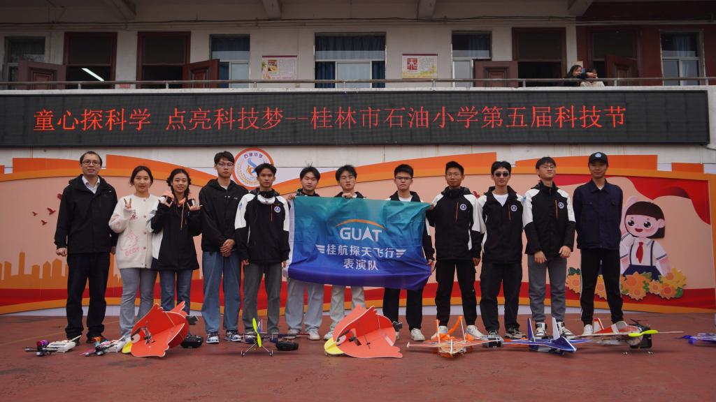 为喜迎第九届航天日,弘扬航天精神,12月15日,必一运动星火先锋支教队和桂航探天飞行表演队前往桂林市石油小学开展“让红领巾搭上中国梦的航班”航天科普活动。