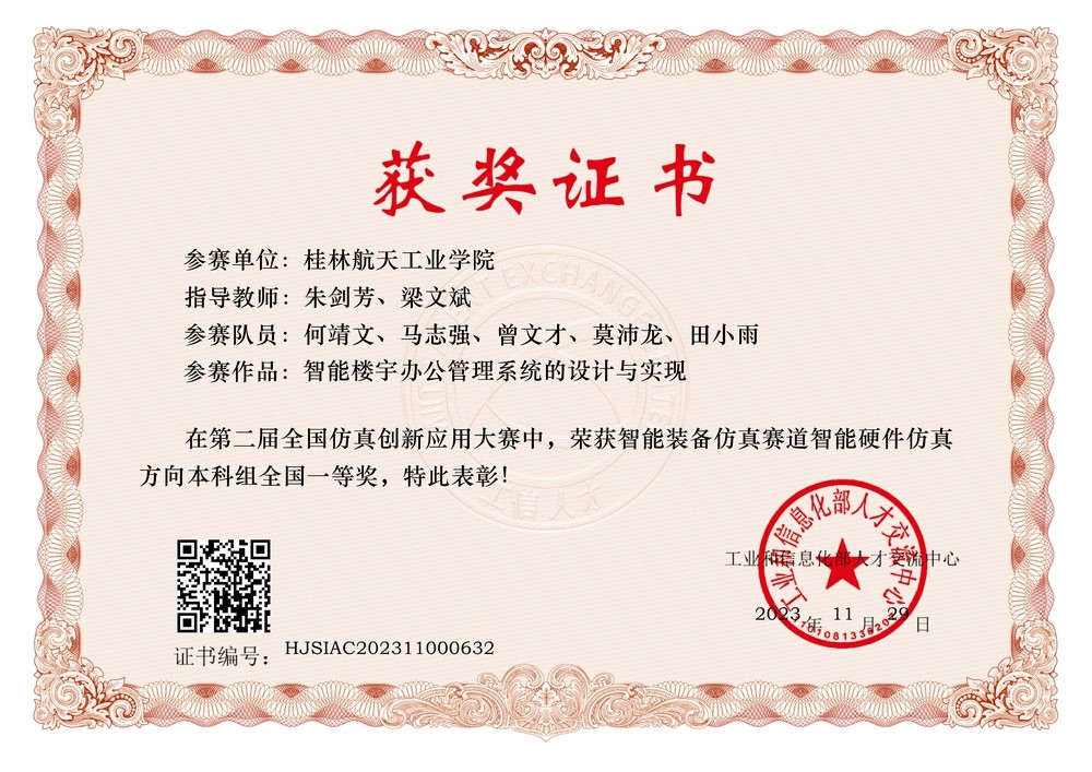 2023年11月12日,工业和信息化部人才交流中心主办的第二届全国仿真创新应用大赛全国总决赛圆满落幕,公司师生在本次大赛中智能装备仿真赛道智能硬件仿真方向荣获本科组全国一等奖2项。