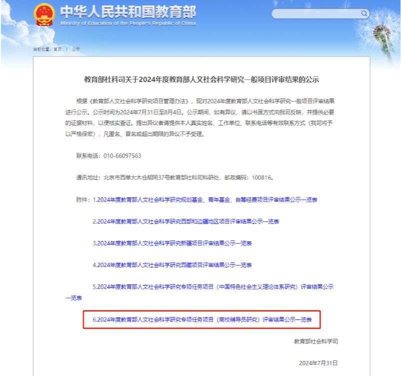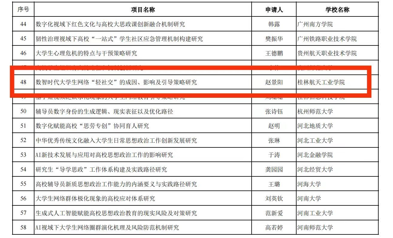 近期,教育部社会科学司对2024年度教育部人文社会科学研究一般项目评审结果进行了公示,公司辅导员赵景阳申报的《数智时代老员工网络“轻社交”的成因、影响及引导策略研究》获批高校辅导员研究专项任务立项,该专项为公司首次获教育部立项,也是本年度广西获批的三个辅导员研究专项之一。