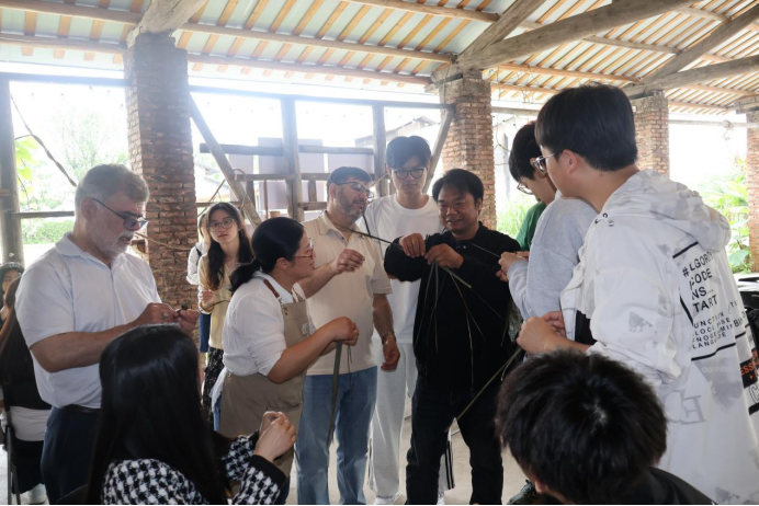 在柘漓乡村文化馆,师生们聆听了非遗传承人关于棕编技艺的讲解,了解了棕编的历史渊源、制作工艺及其在民俗文化中的重要地位。随后,在棕编艺人的指导下,中外师生亲身体验了棕编制作过程。来自不同国家的外教老师对中国传统手工艺表现出极大的兴趣,他们认真观摩、积极尝试,在艺人的耐心指导下,完成了简单的棕编作品。来自英国的Atta Ullah说:“棕编技艺让我惊叹,它不仅需要精湛的手工技巧,更体现了中国人对自然的敬畏和智慧,这次体验让我对中国文化有了更深的理解。”