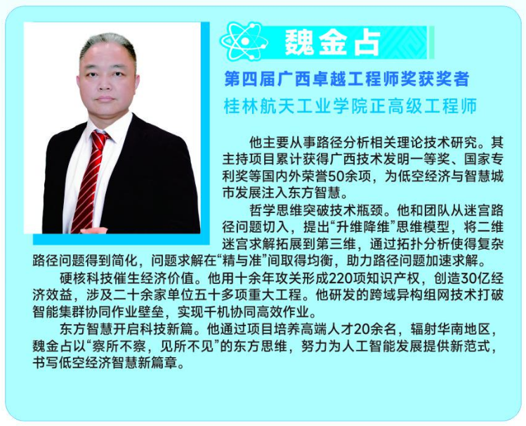 魏金占教授在寻求解决工程复杂问题的精准路径的同时,组织8个科研创新团队,集体攻关硬核科技,研究路径分析相关理论技术,辐射华南地区20余家单位50多项重大工程,其主持的项目累计获广西技术发明一等奖、国家专利奖等国内外荣誉50余项,研发的跨域异构组网技术打破智能集群协同作业壁垒,实现千机协同高效作业,培养高端人才20余名。