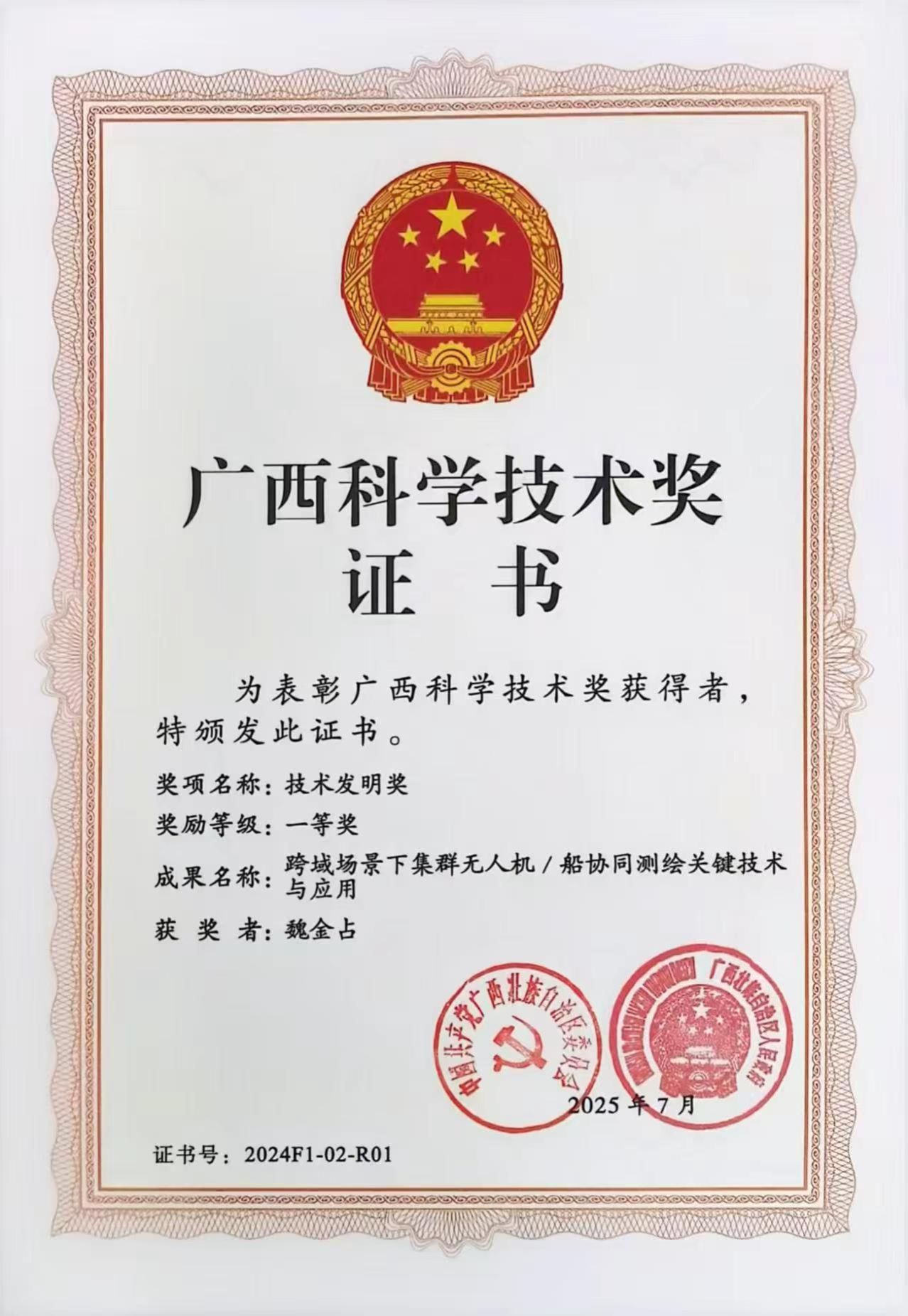 7月4日,自治区党委、政府在南宁召开2025年广西科学技术奖励大会。公司魏金占教授牵头的科技成果《跨域场景下集群无人机/船协同测绘关键技术与应用》,获技术发明一等奖。