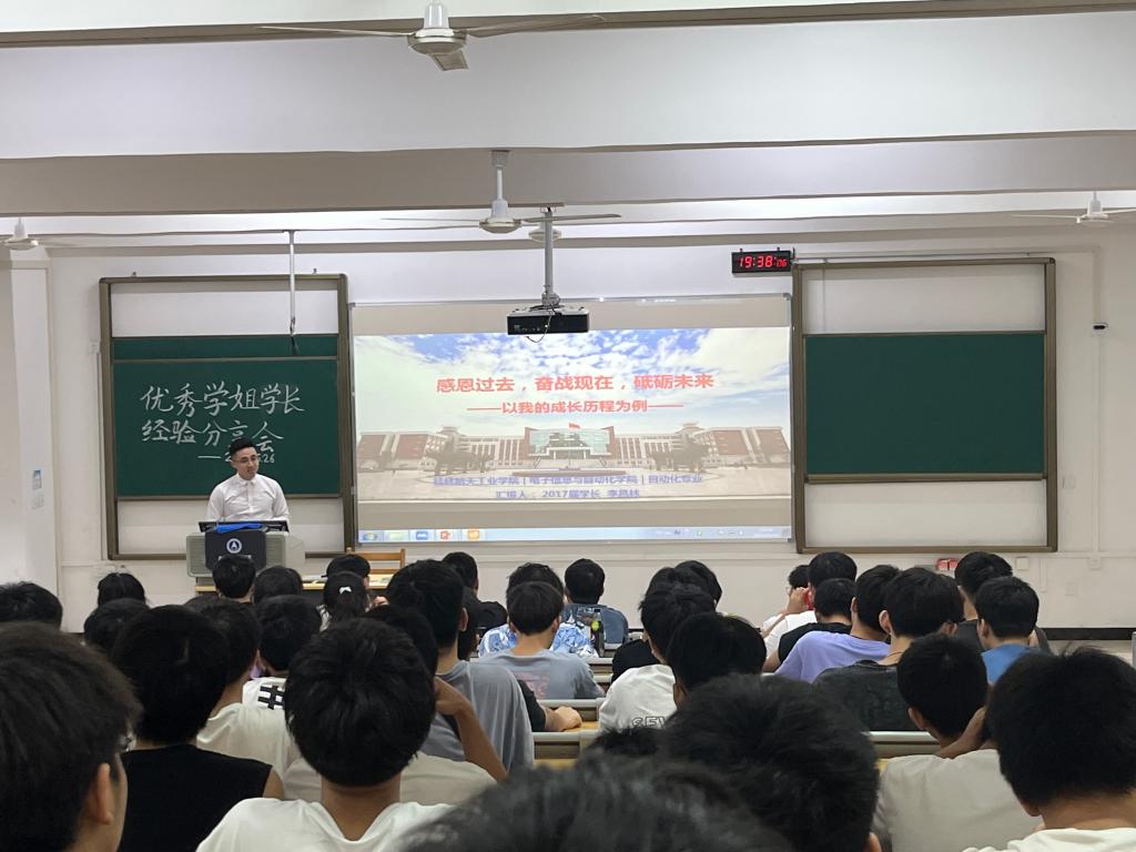会议开始,陈业航老师介绍了四位参与分享的学长学姐,他们分别是13级自动化一班邵将学长、李娇学姐、13级自动化四班的李昌林学长以及梁迎旭学长、首先,邵将学长(哈尔滨工业大学在读博士)从三个方面进行了学业交流分享:第一,找到一个志同道合的学伴;第二,培养锲而不舍的学习精神;第三,要树立一个坚定的目标并为之努力。随后,李娇学姐(研究生就读于广西师范大学高等教育学专业)为大家讲述了考研与实习的坎坷经历和心路历程,她鼓励同学们提前规划学业目标。最后,李昌林学长(知名企业从事专业工作)和梁迎旭学长(公务员)着重强调了学习效率以及考研的重要性,并建议同学们提前做好职业规划,并有一个为之努力的方向。